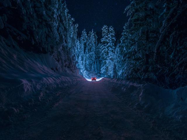 Wallpaper Snow, Road, Winter night, Sun, Moon, Stars, Winter road