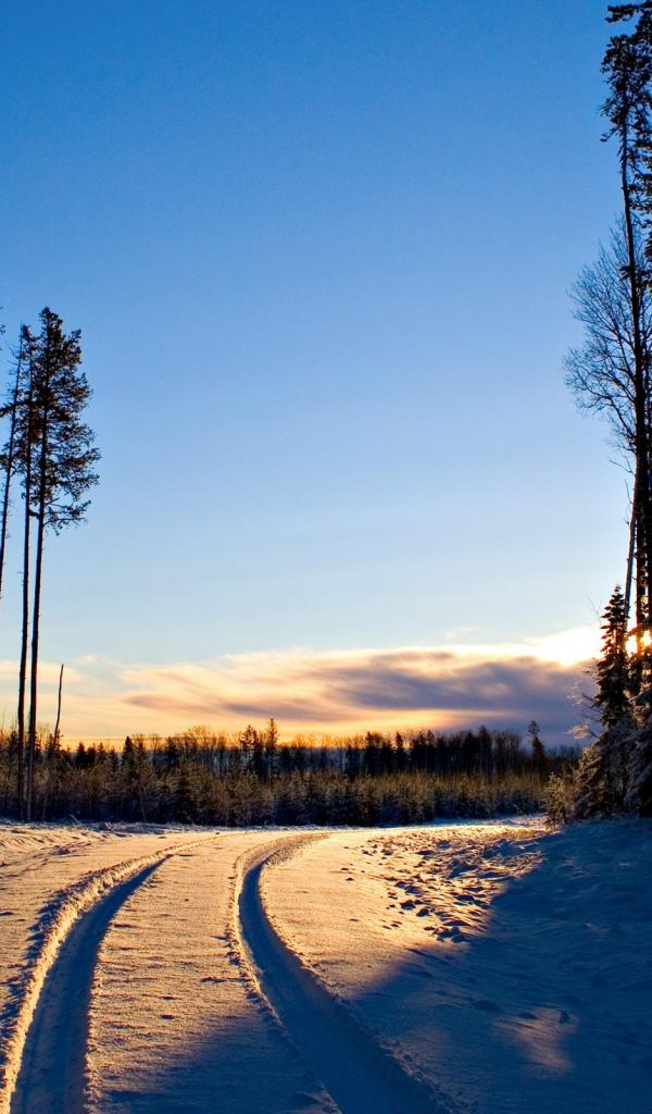 Wallpaper Snow-covered road in the evening