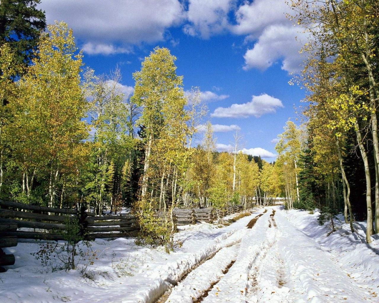 Wallpaper Autumn trees on the background of the first snow reflected in the water