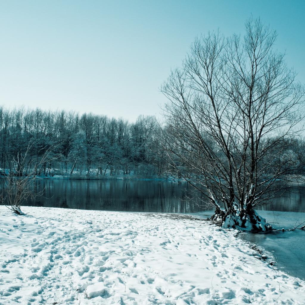 Wallpaper Shore of the lake is covered with snow