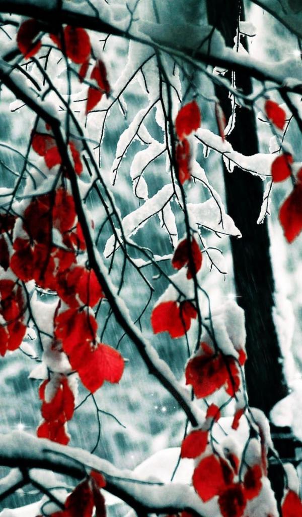 Wallpaper Red leaves in snow
