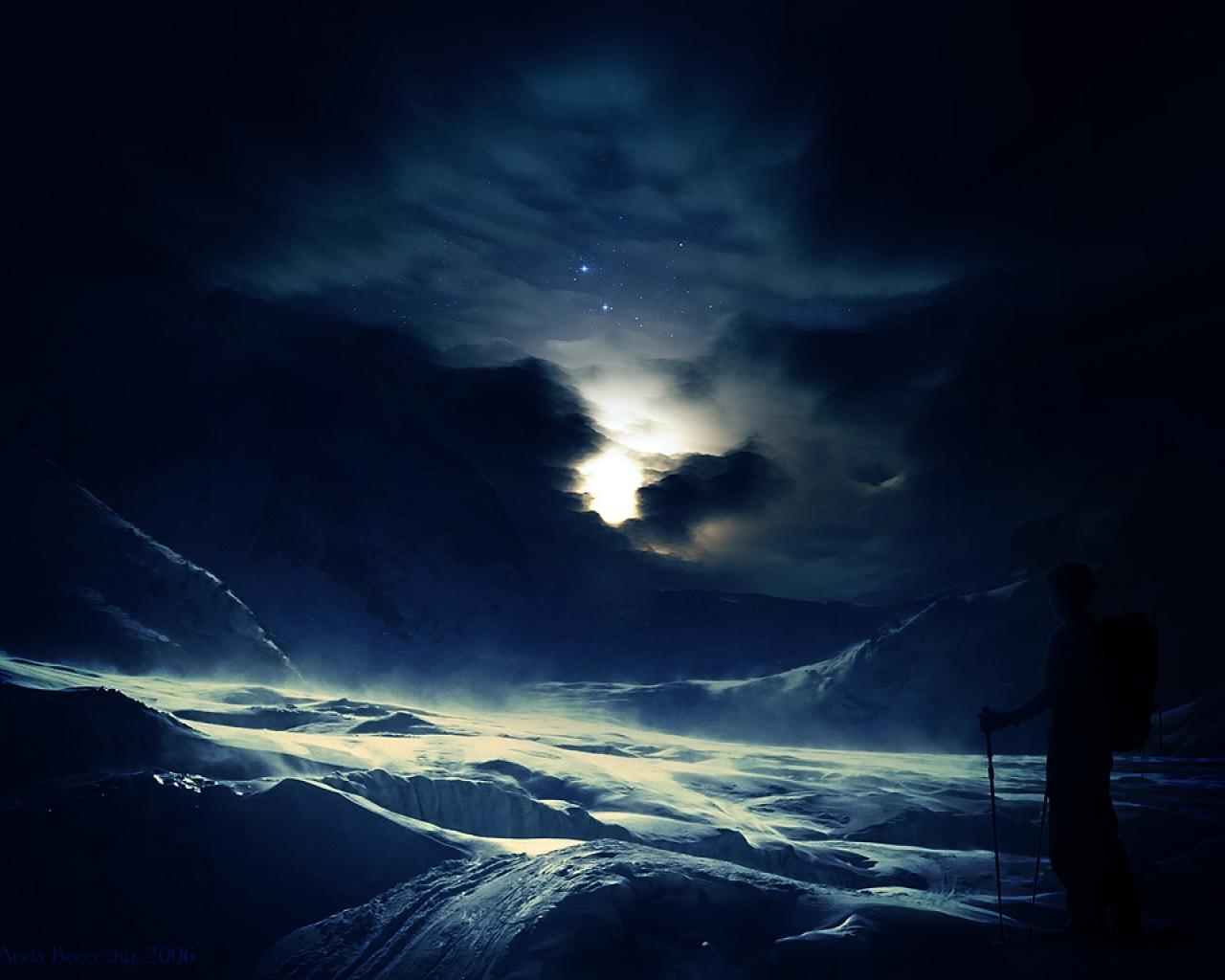 Wallpaper Snow, Road, Winter night, Sun, Moon, Stars, Winter road