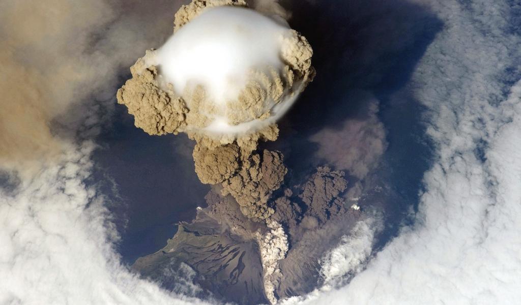 Wallpaper A cloud of smoke over the volcano, photo from space