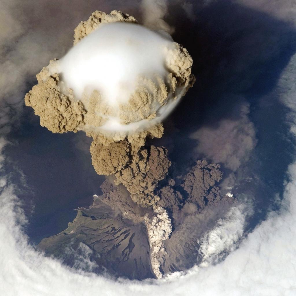 Wallpaper A cloud of smoke over the volcano, photo from space