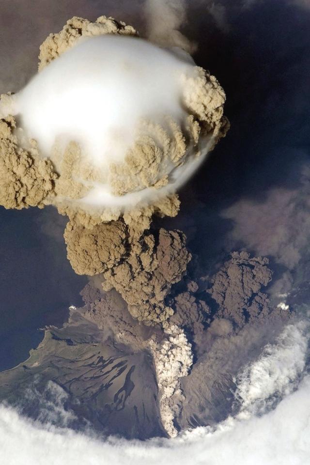 Wallpaper A cloud of smoke over the volcano, photo from space