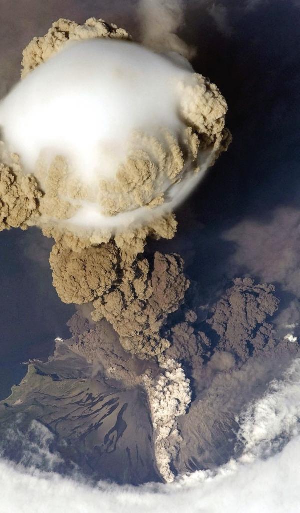 Wallpaper A cloud of smoke over the volcano, photo from space