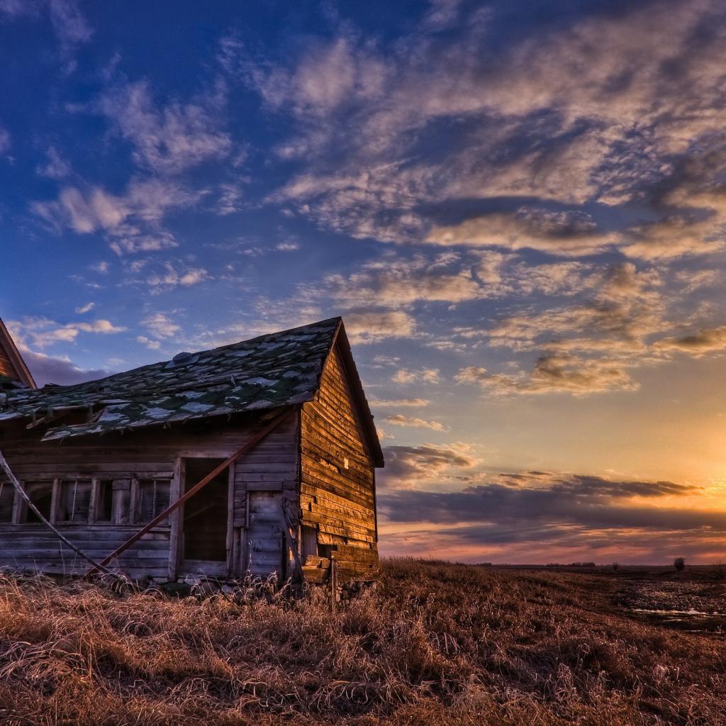 Wallpaper Wooden house with a damaged roof at sunset
