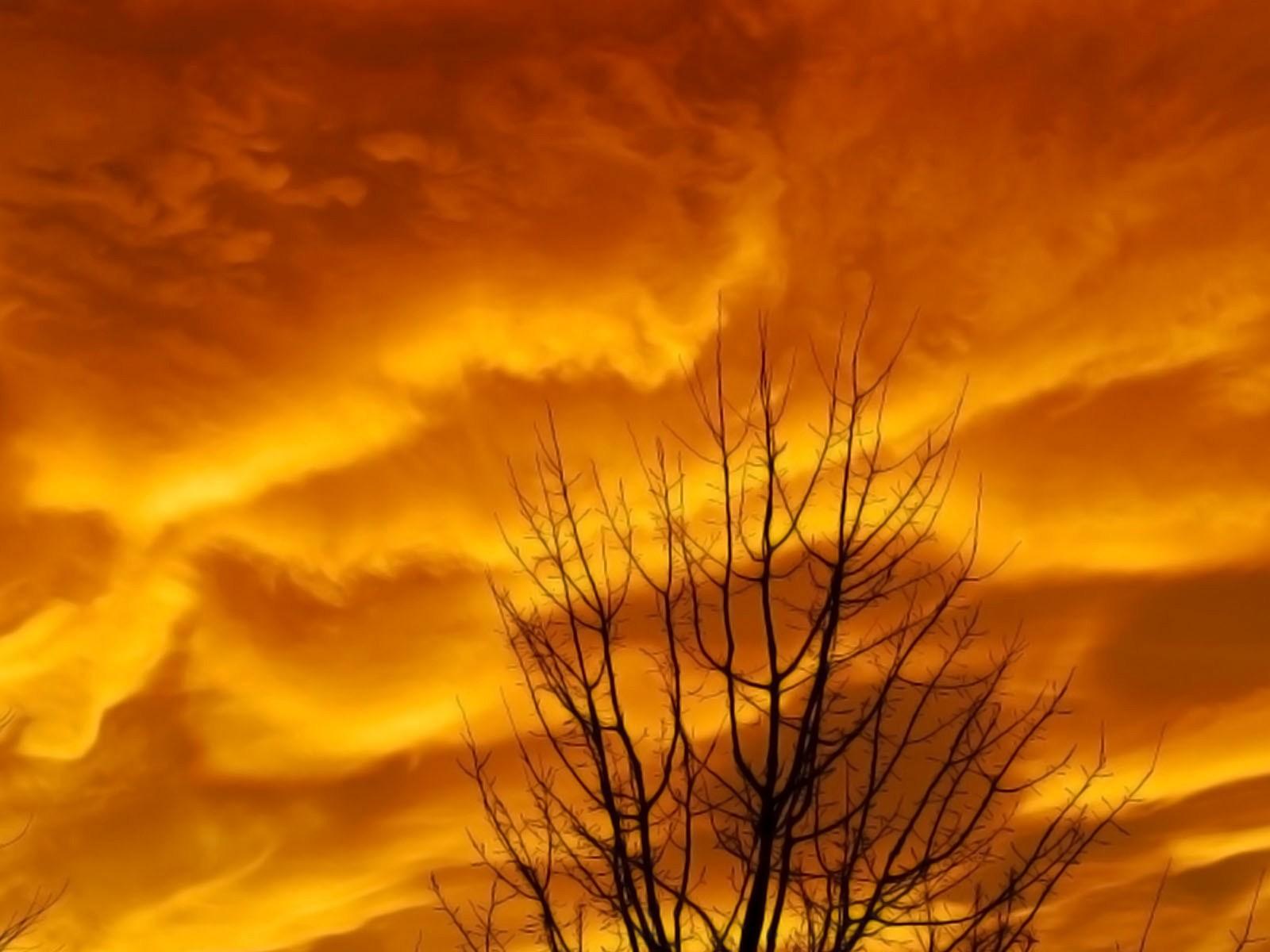 Wallpaper The bare branches of a tree against the orange clouds sunset
