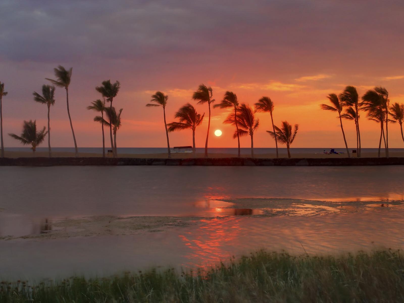 Wallpaper A number of palm trees on the beach at sunset