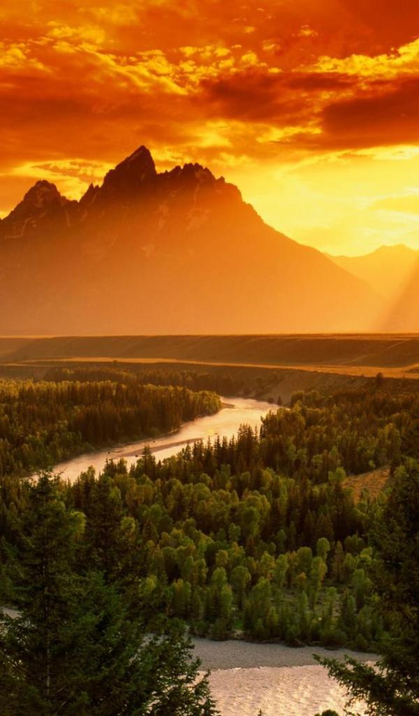 Wallpaper Sunset over the river in a mountain valley