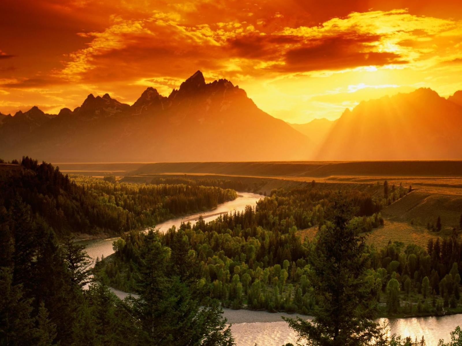 Wallpaper Sunset over the river in a mountain valley
