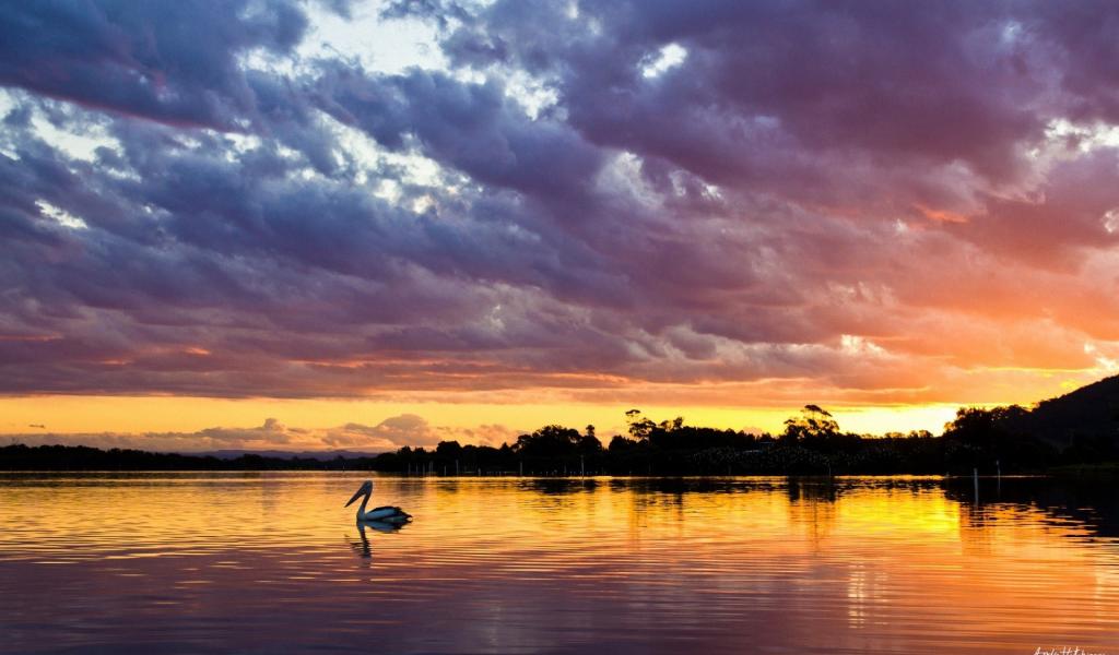 Wallpaper Sunset over the lake with a bird