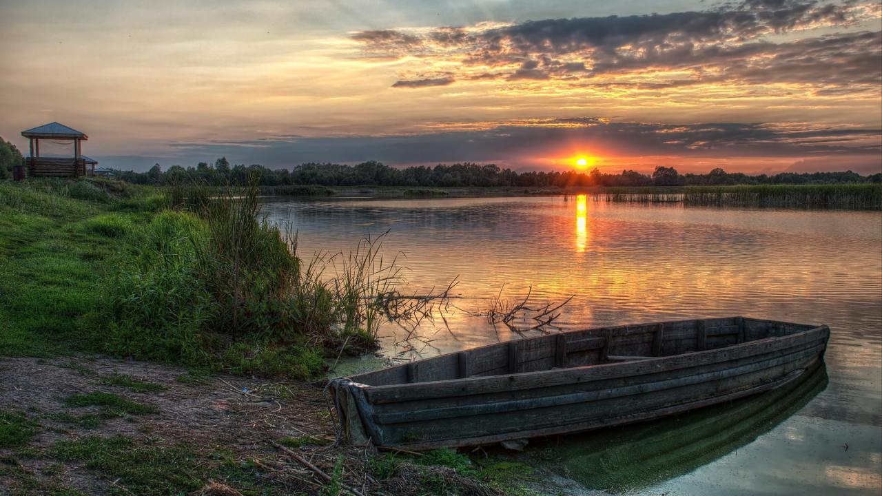 Wallpaper Sunset on the lake in the village