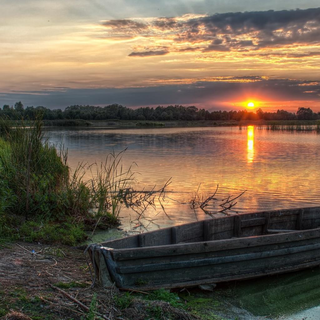 Wallpaper Sunset on the lake in the village