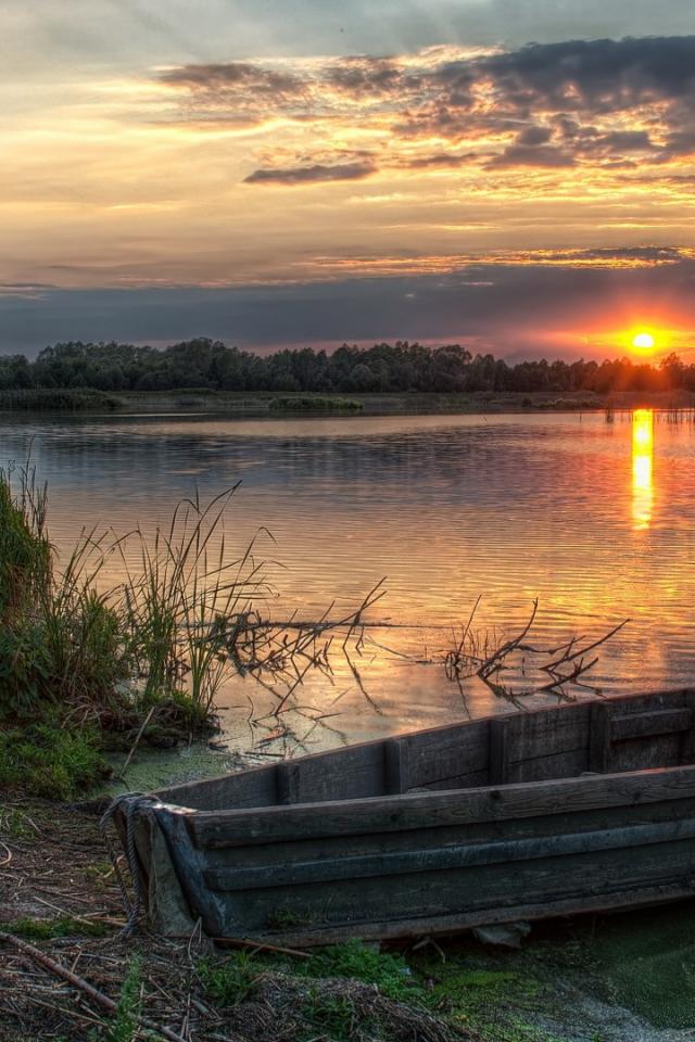 Wallpaper Sunset on the lake in the village