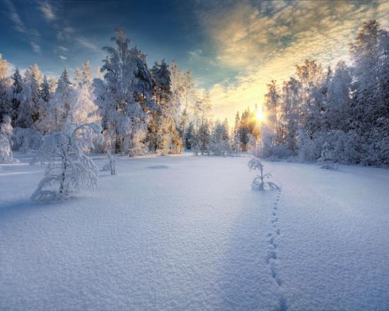 » Wallpaper Sunset in the white snow-covered forest