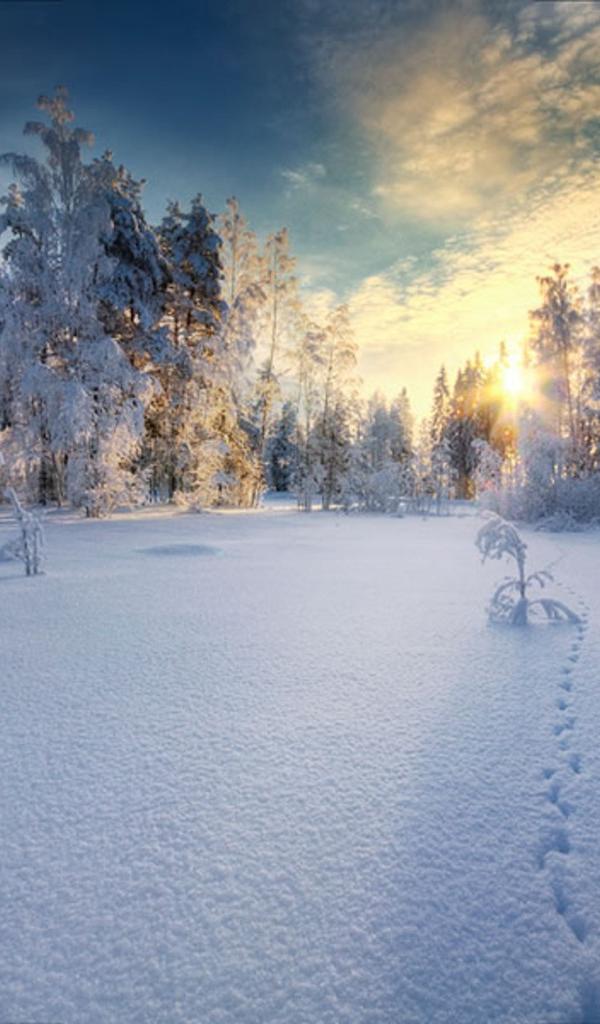 Wallpaper Sunset in the white snow-covered forest