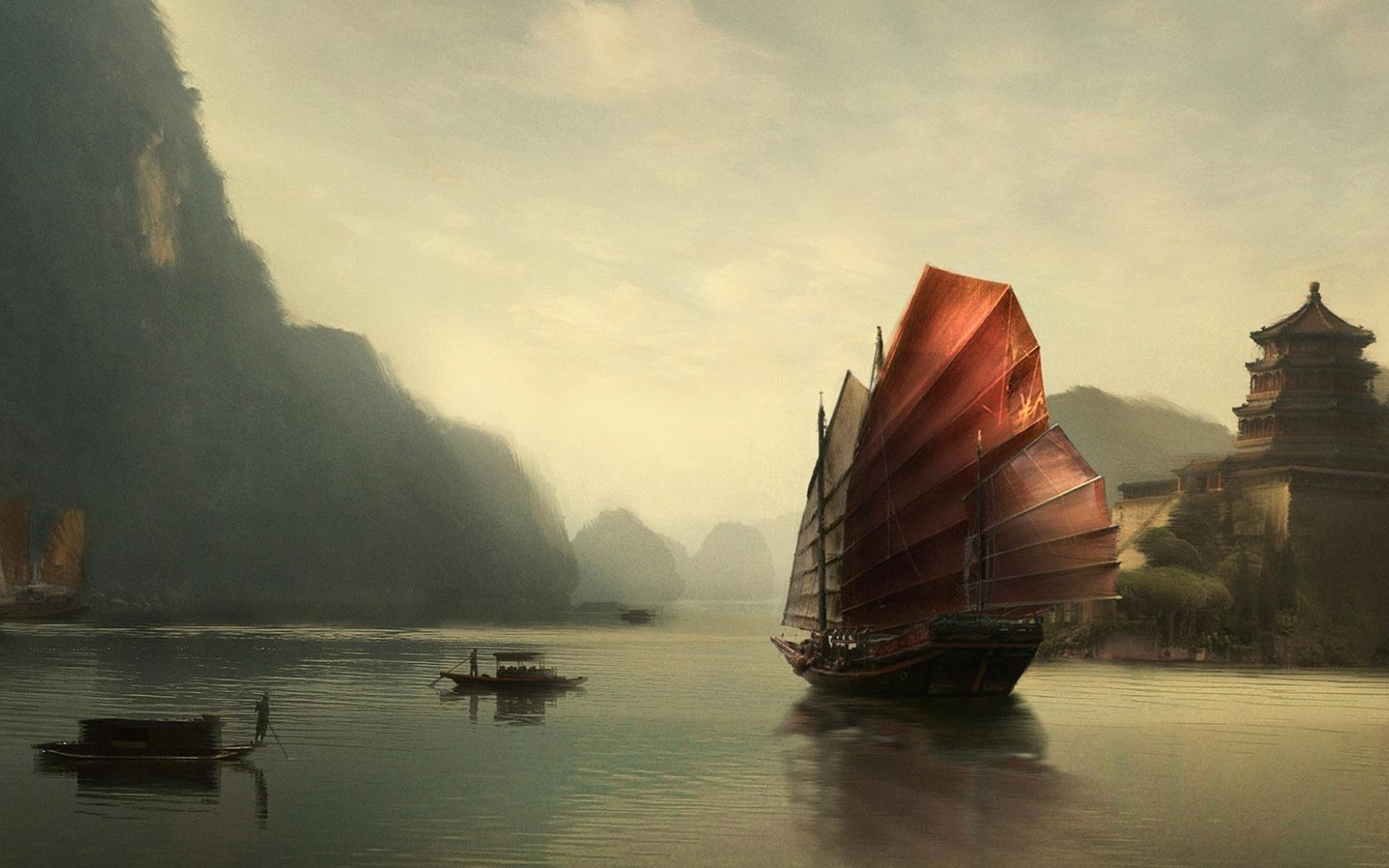 Wallpaper Chinese junk on the lake