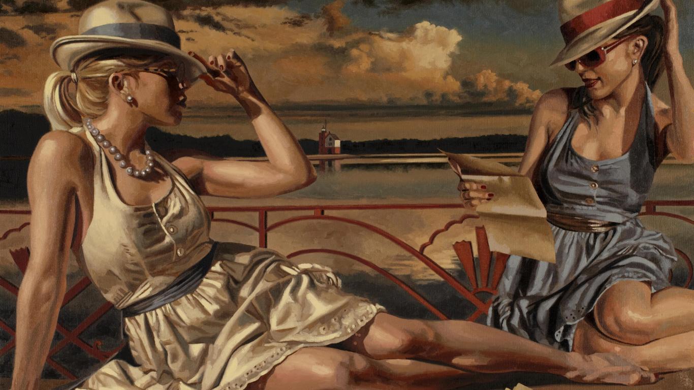 » Wallpaper Girls resting on the lake shore