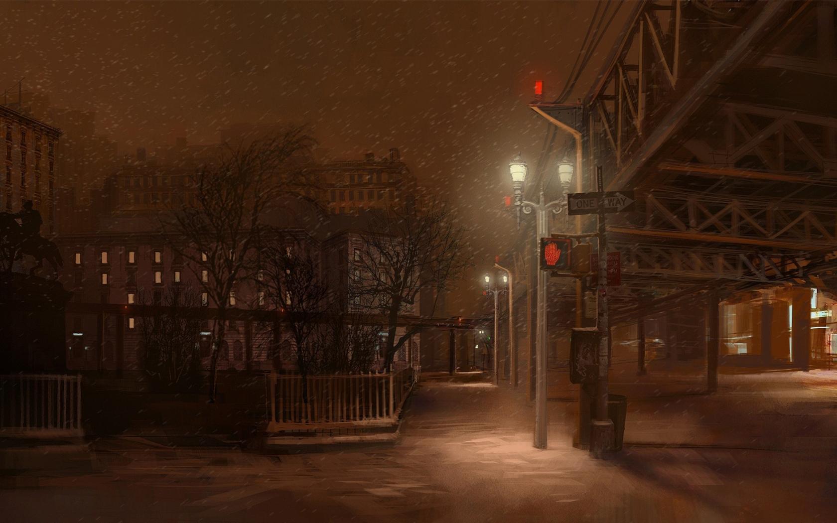 Wallpaper Light snow at night street