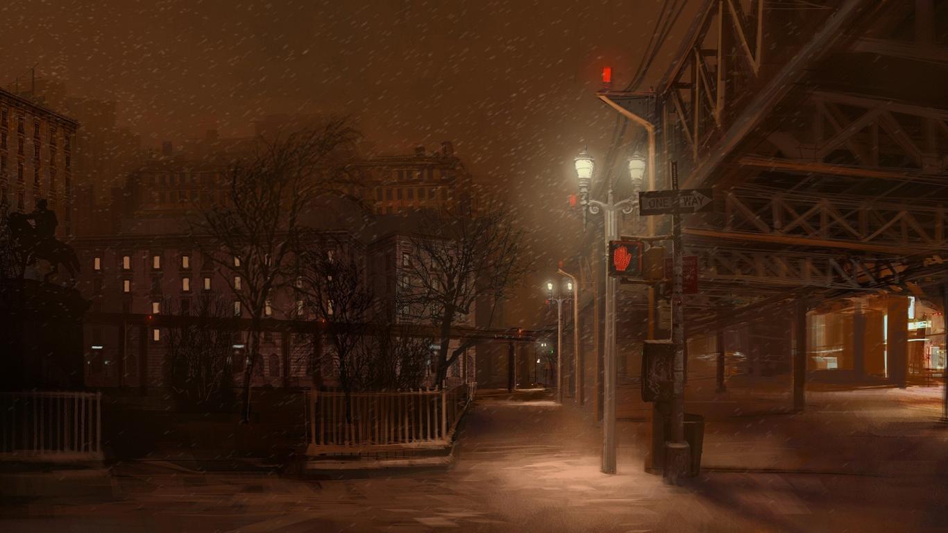 Wallpaper Light snow at night street