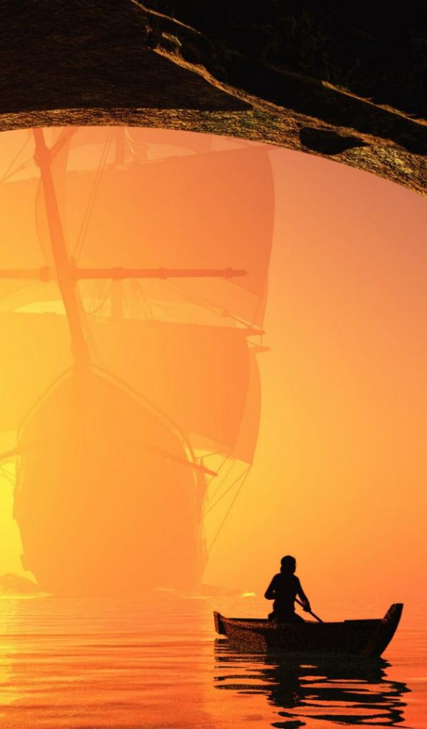 Wallpaper Sunset boat into the cave