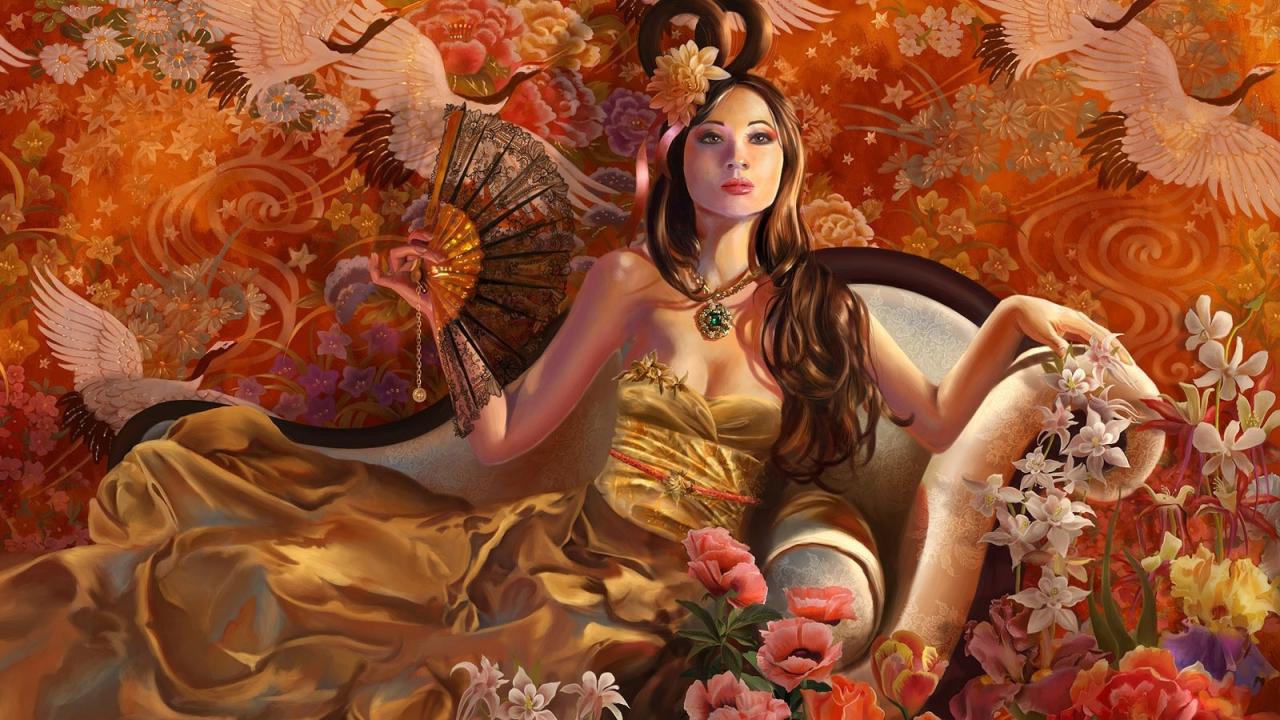 Wallpaper Girl with a fan in the chair