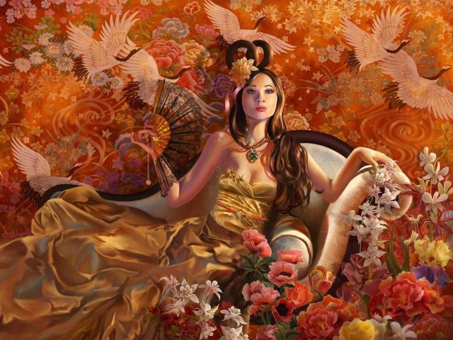 Wallpaper Girl with a fan in the chair