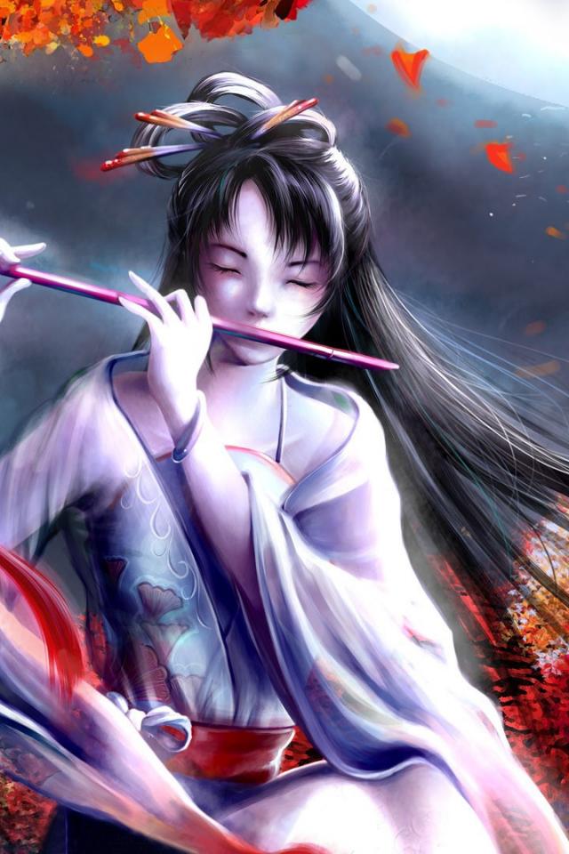 Wallpaper Japanese woman plays the flute