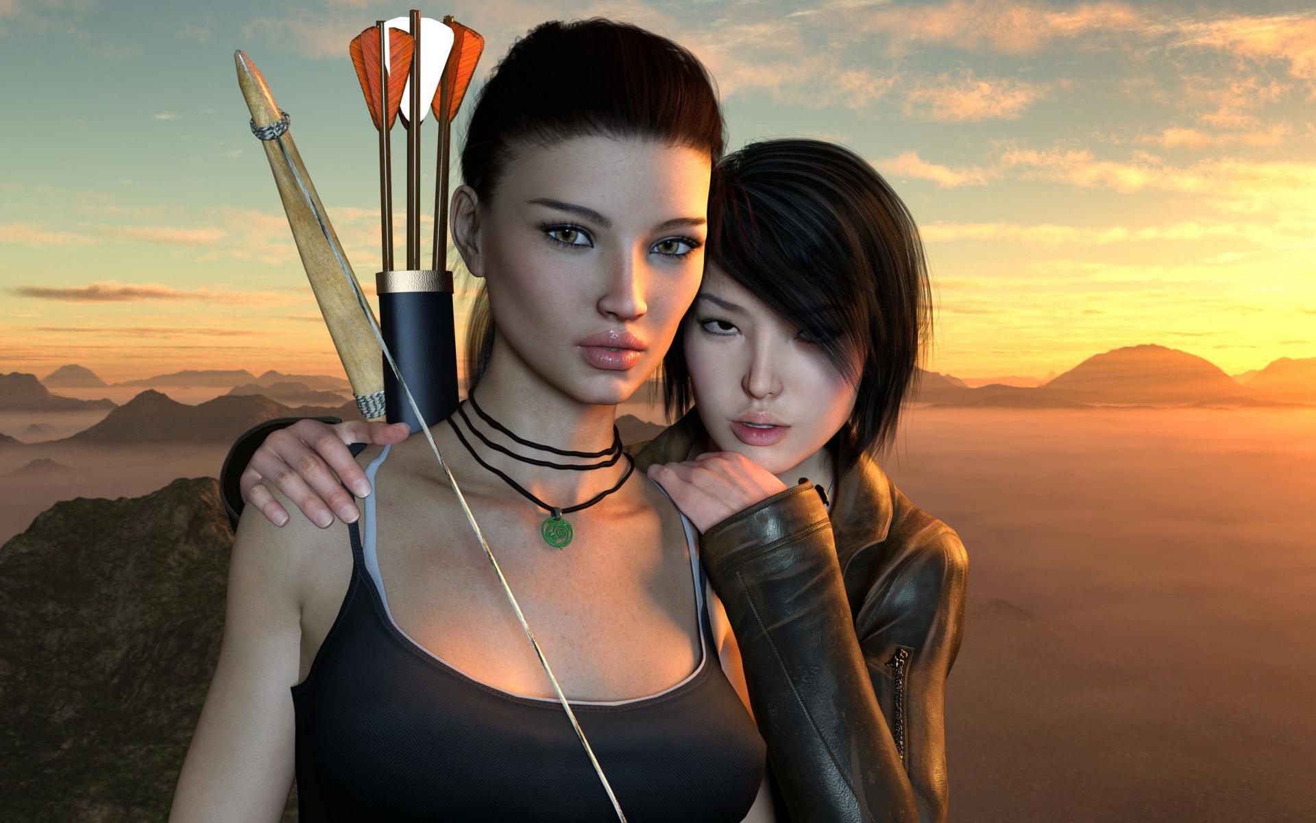 Обои Две 3д девушки с луком и стрелами