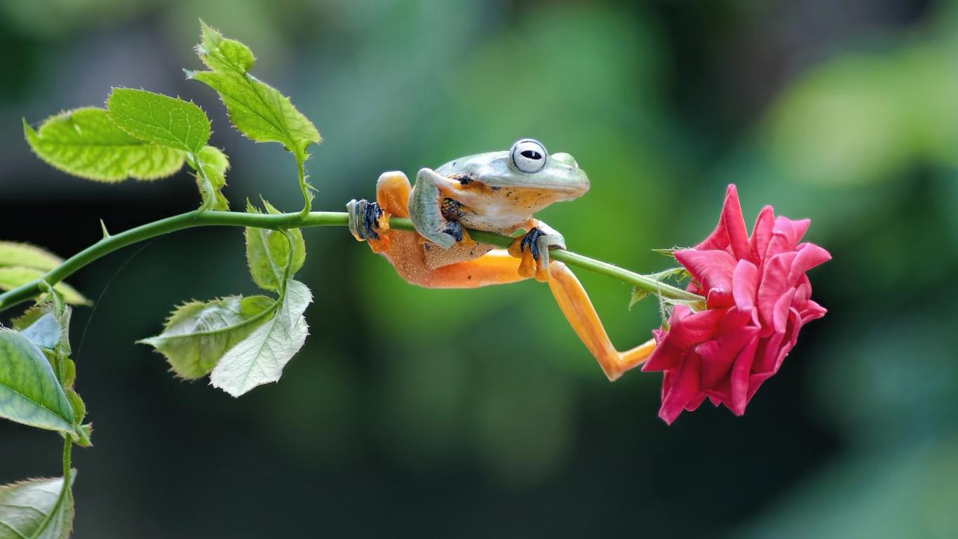 Обои Маленькая зеленая лягушка сидит на розе