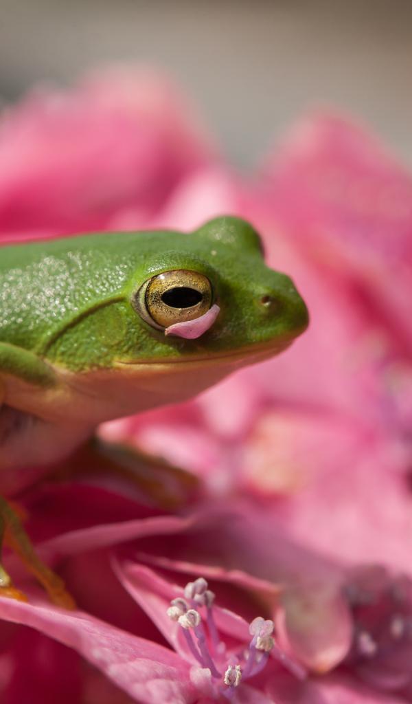 Обои Зеленая лягушка сидит на розовом цветке