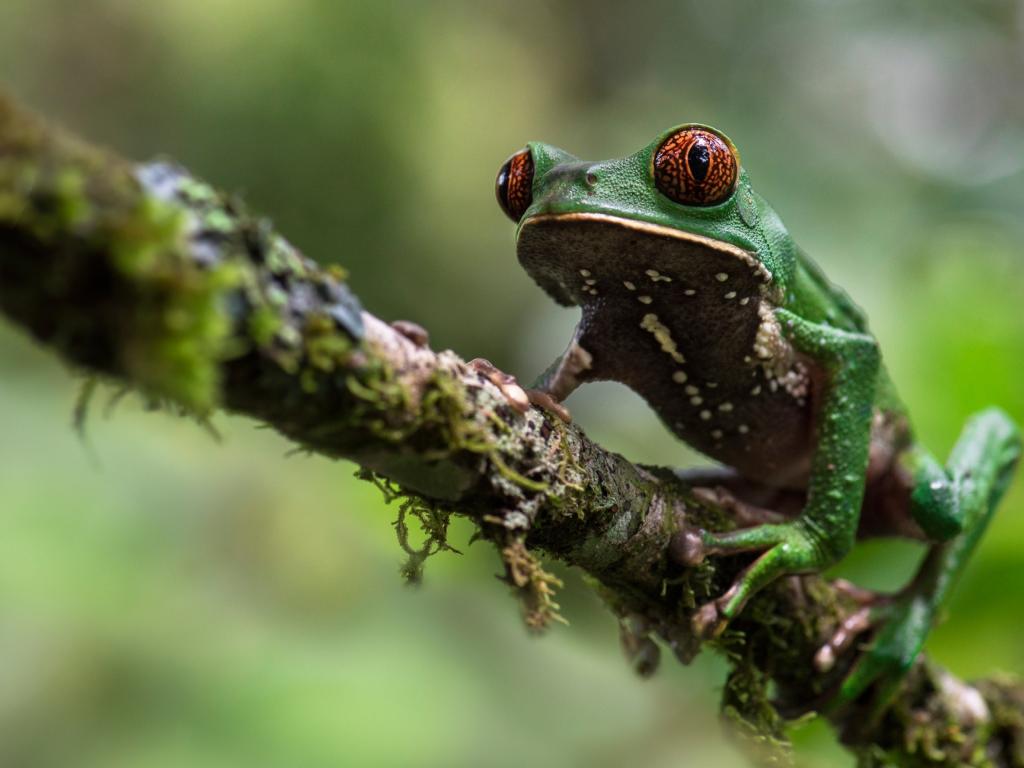 Обои Зеленая лягушка сидит на ветке