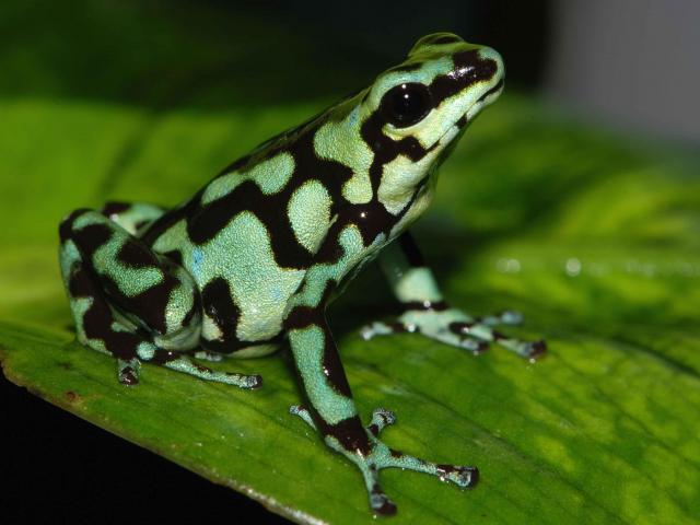 Обои Черно зеленая ядовитая лягушка сидит на зеленом листе