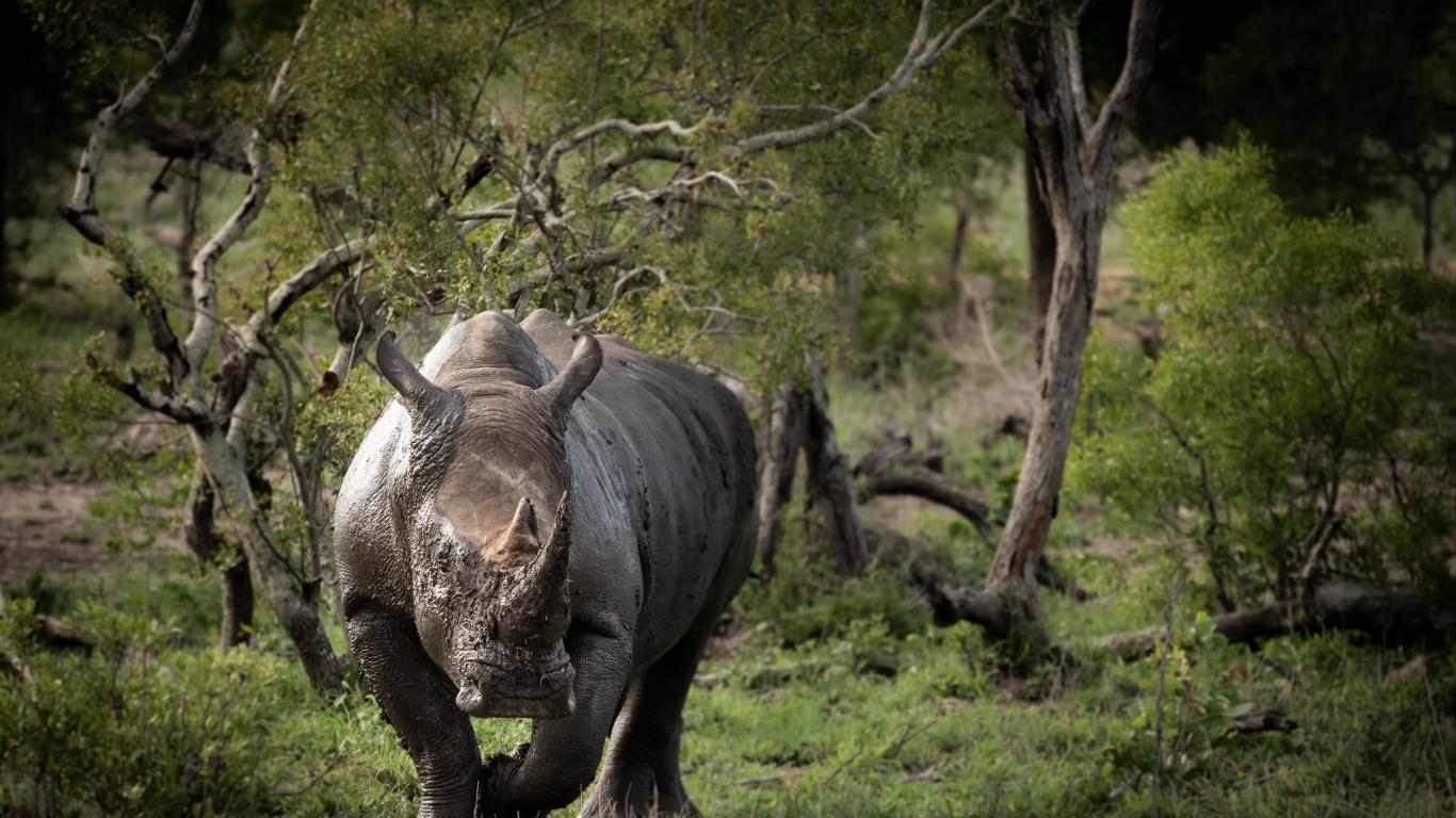 Обои Большой носорог в грязи идет по траве