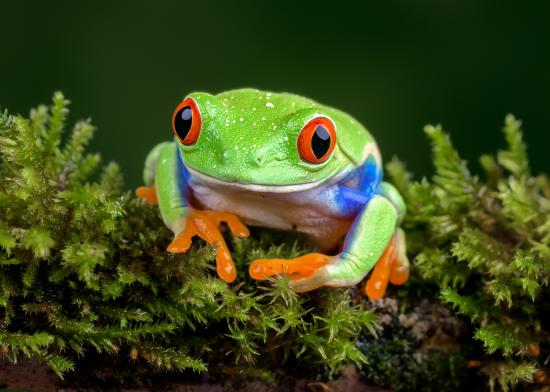 Обои Большая зеленая лягушка с красными глазами сидит на покрытой мхом ветке