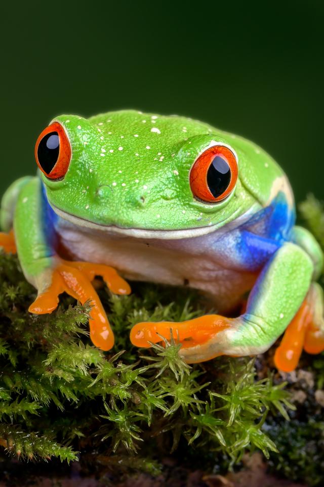 Обои Большая зеленая лягушка с красными глазами сидит на покрытой мхом ветке