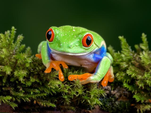 Обои Большая зеленая лягушка с красными глазами сидит на покрытой мхом ветке