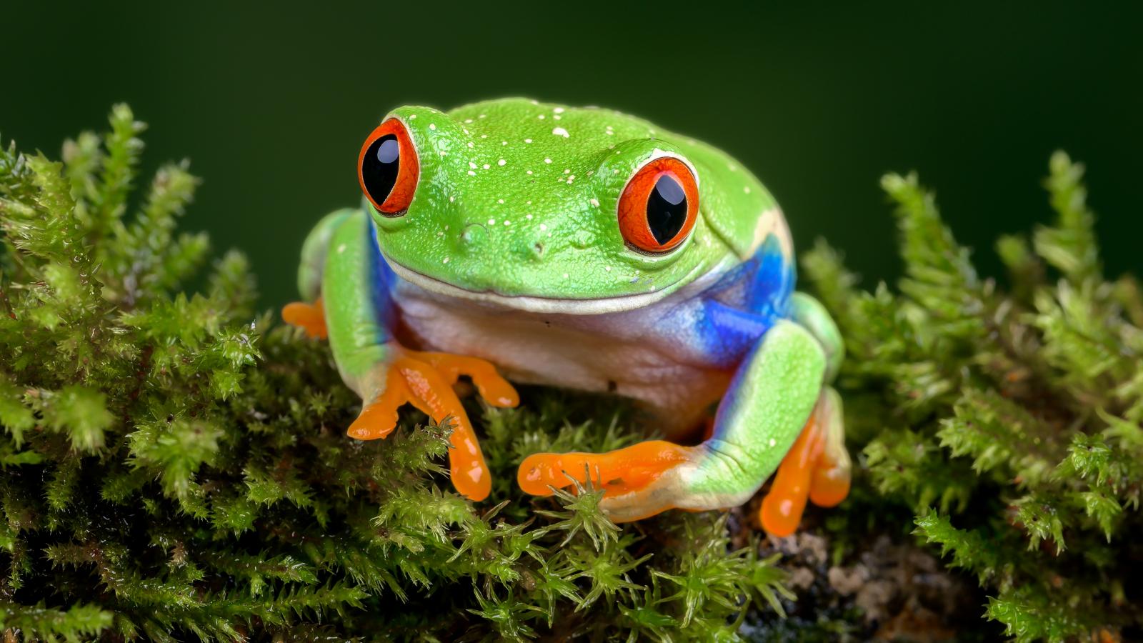 Обои Большая зеленая лягушка с красными глазами сидит на покрытой мхом ветке