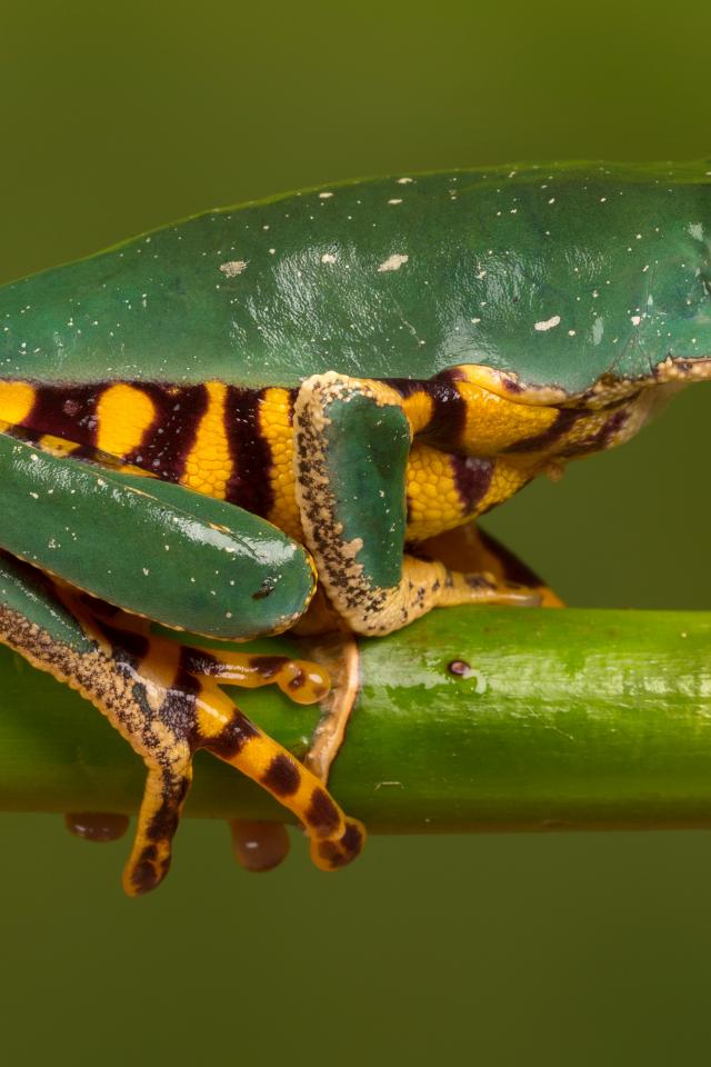 Обои Зеленая лягушка с желтым пузом сидит на зеленой ветке