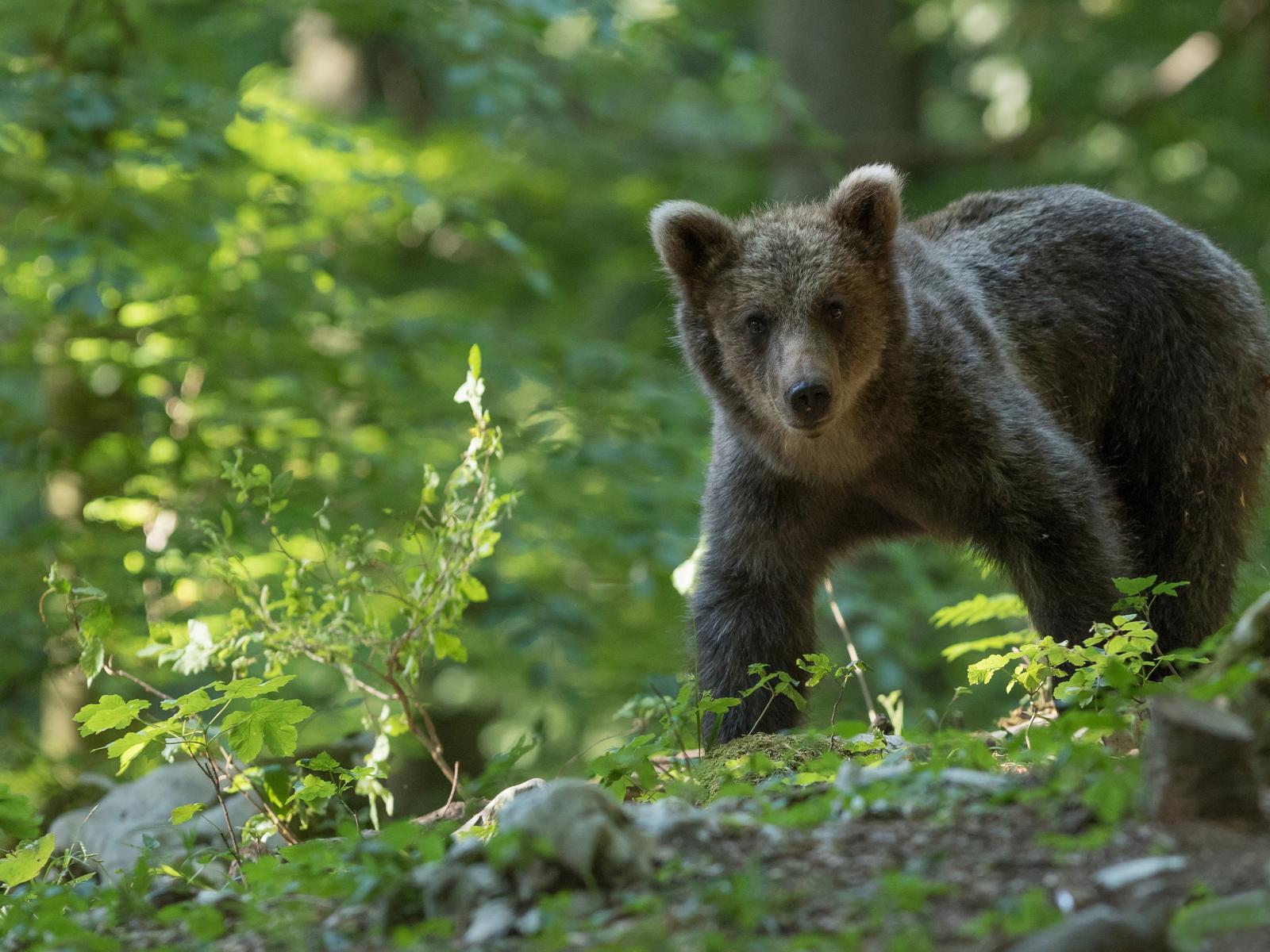 Обои Маленький бурый медвежонок стоит на поляне с белыми цветами