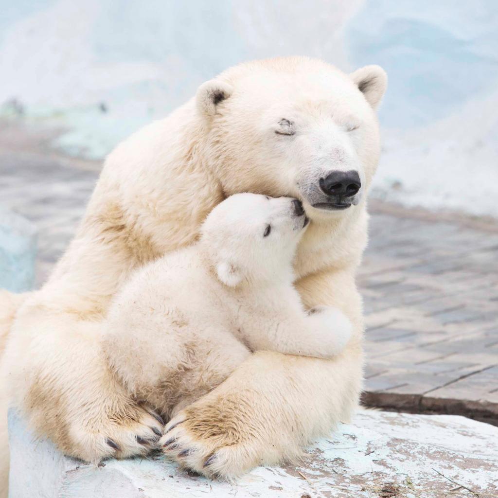 Обои Большая белая медведица обнимает медвежонка