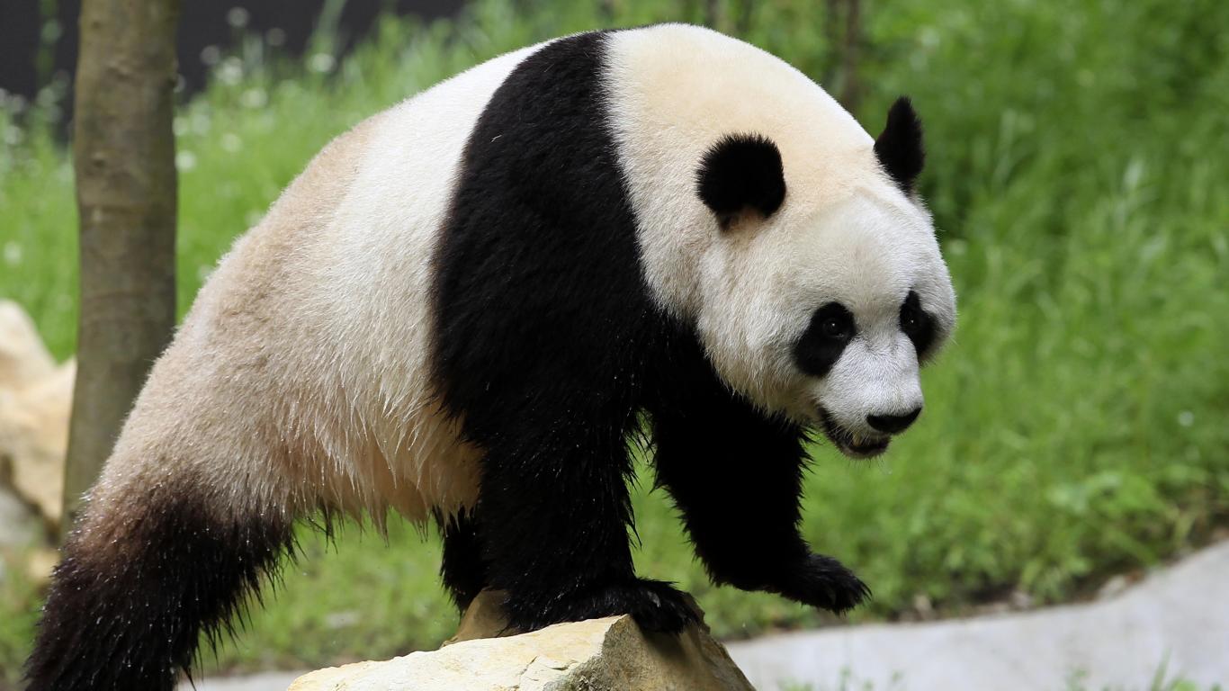 Обои Мокрый большой медведь панда стоит на камне