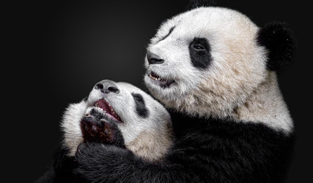 Обои Большая панда с детенышем на сером фоне