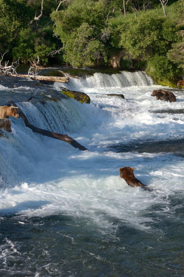 Обои Бурые медведи ловят рыбу в горной реке