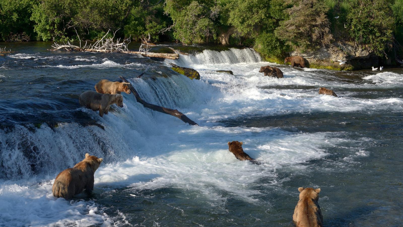 Обои Бурые медведи ловят рыбу в горной реке