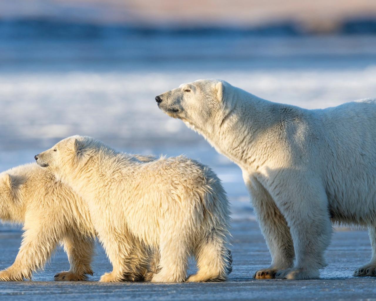 Обои Большая белая медведица с медвежатами на снегу