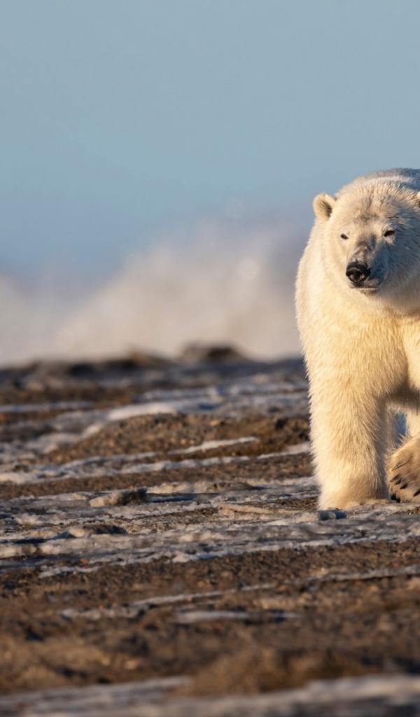 Обои Большой белый медведь идет по песку
