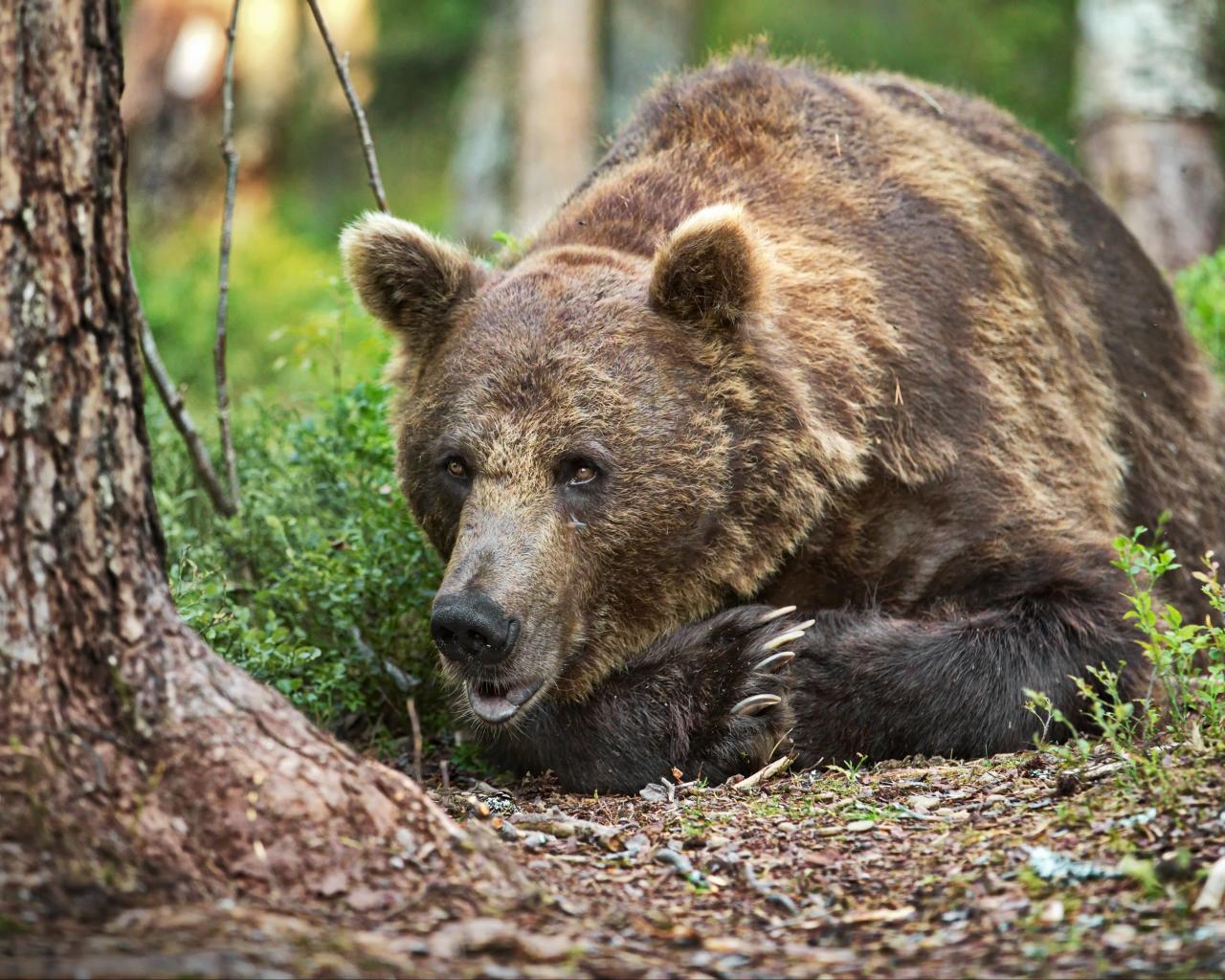 Обои Большой бурый медведь лежит на траве в лесу