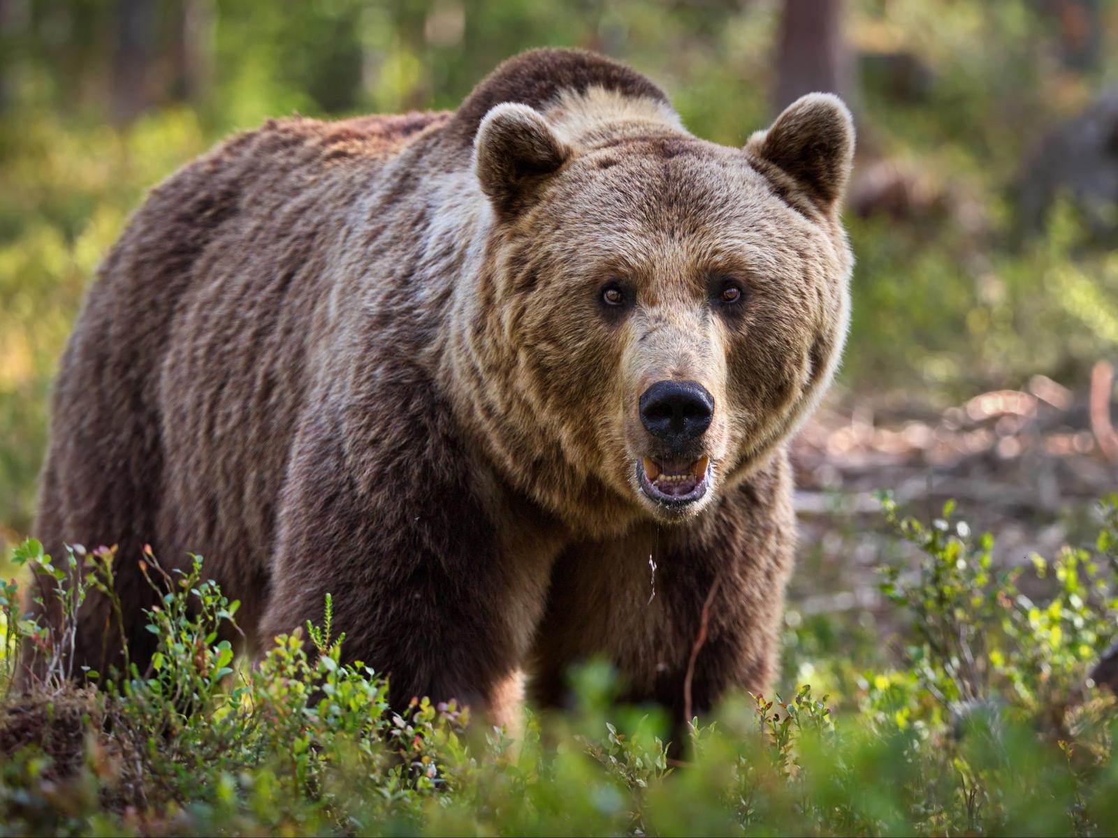 Обои Большой грозный бурый медведь идет по траве